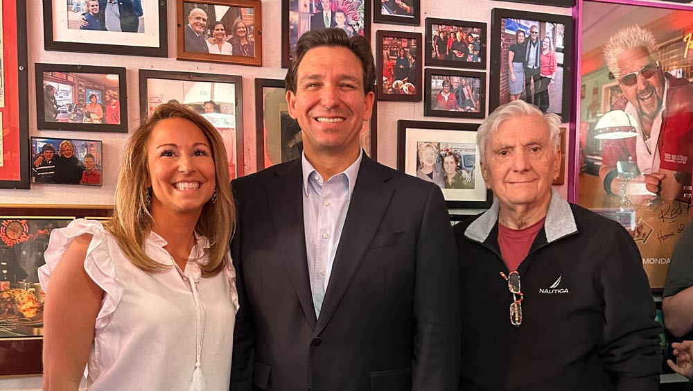 During a visit to Red Arrow Diner in Manchester, Governor Ron DeSantis poses with Red Arrow Diner Co-Owners, Amanda Wihby and George Lawrence.