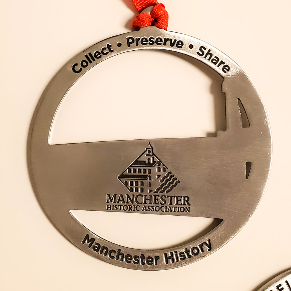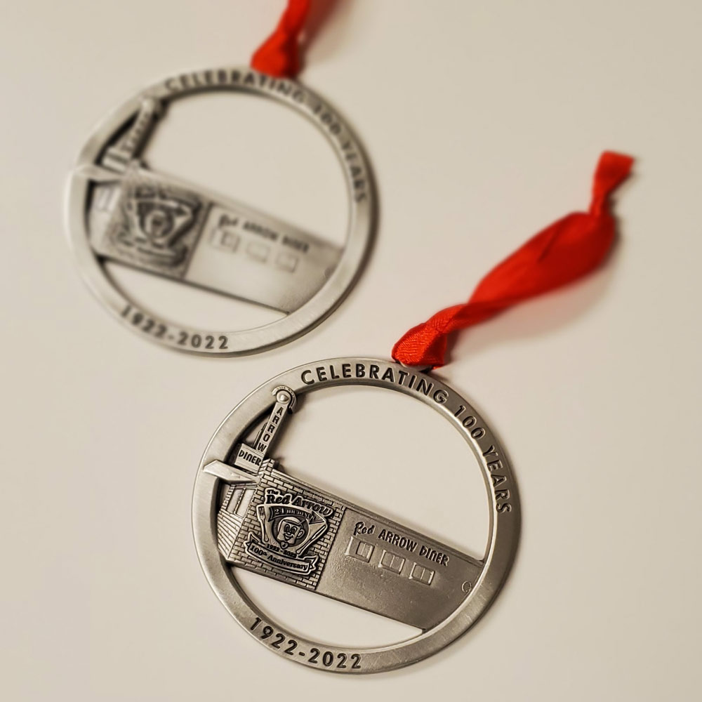 The original, historic, Red Arrow Diner location, cast in a 3-inch, 3D, all pewter, 100th anniversary commemorative ornament with a red ribbon.